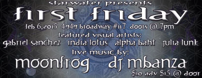 The First Friday of every month the StarWater Collective throws down w/ great local talent! Featured visual artist Gabriel Sanchez, Alpha Baht, India Lotus and JULIA Lunk shall adorn the walls with their immaculate artwork. Doors open @7p for art gallery then muzix @9p starting off with DJ Mbanza followed by MoonFrog. $10 adv. $15@door. Come get down w/ the StarWater Crew! ***Featured Elixirs***